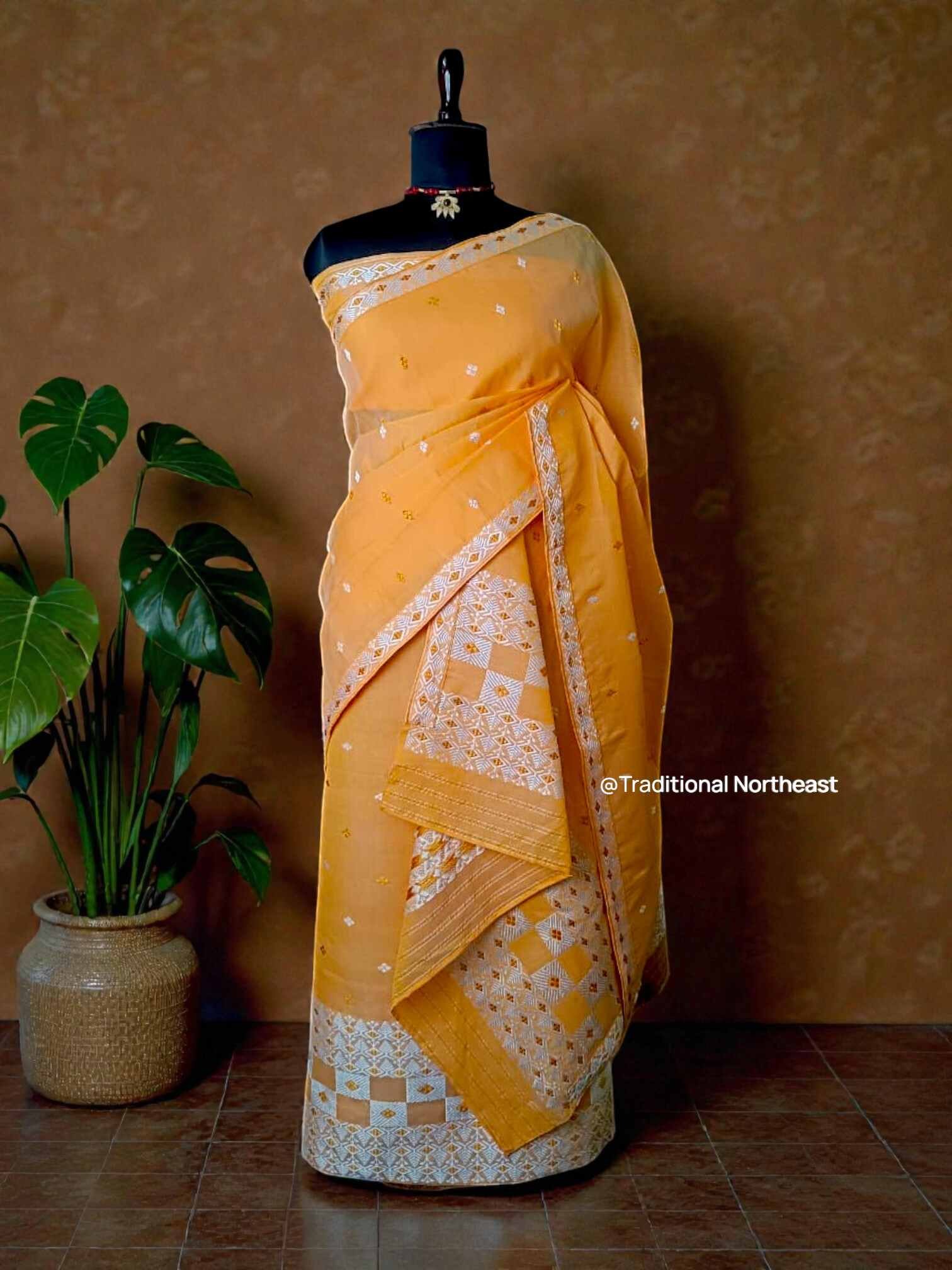 - Motifs – Silver Zari, Orange Thread Work